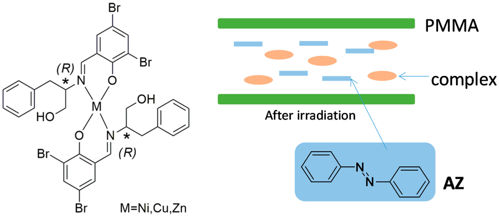 - Ito, M.; Akitsu, T. Polarized UV light induced molecular arrangement depending on flexibility of chiral Schiff base Ni(II), Cu(II), and Zn(II) complexes by azobenzene in PMMA matrix. Comtemp. Eng. Sci. 2014, 7, 869–877. [Google Scholar]
