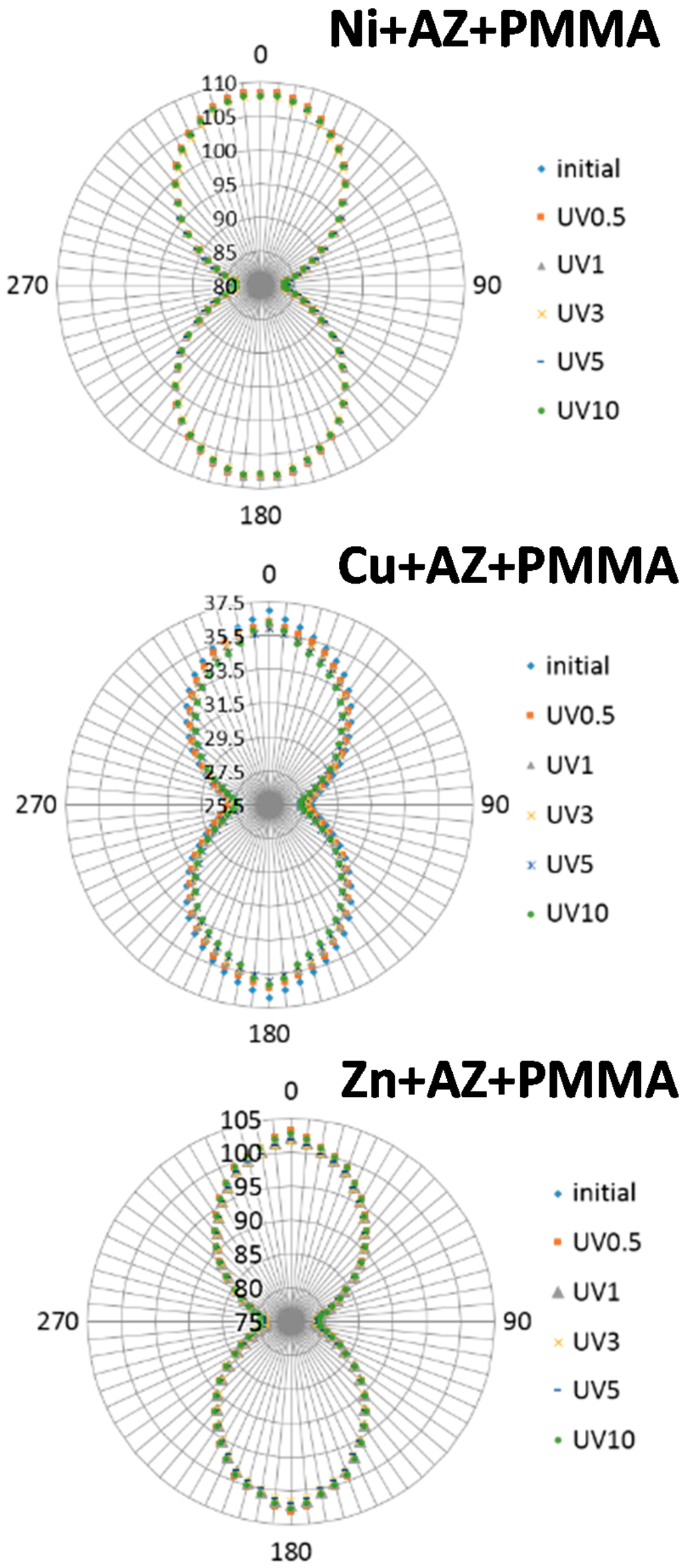 Angular dependence of polarized IR spectra (C=N bands at 1634, 1628, and 1617 cm−1) after irradiation of linearly polarized UV light Ni+AZ+PMMA, Cu+AZ+PMMA, and Zn+AZ+PMMA, respectively.