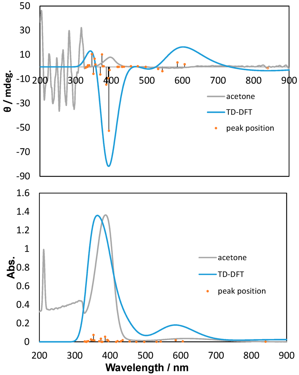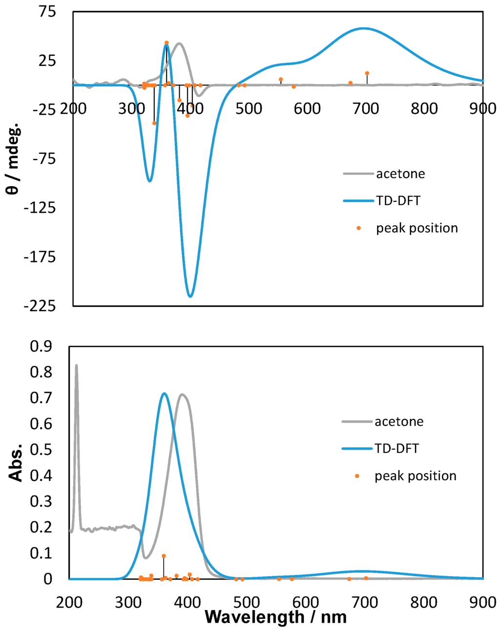 Figure 3, Figure 4 and Figure 5 exhibit experimental (in acetone solution) and simulated (UB3LYP/6-31G(d)) CD and UV-Vis spectra of Ni, Cu, and Zn, respectively, based on optimized structures (Figures S1–S3). The π–π*, n–π*, and d–d bands could be reasonably assigned based on a theoretical simulation using Gaussian09 []. As the model structures in PMMA, the optimized structures of Ni and Cu afford a tetrahedrally distorted square planar geometry indicating dipole moment 3.2694 Debye with direction vector (x, y, x) = (1.7223, 0.7499, −2.6759)) and 5.2898 Debye with (−1.5744, 4.2113, 2.7872), while that of Zn affords a compressed tetrahedral geometry indicating 8.2269 Debye with (4.6534, −5.7037, 3.6736).