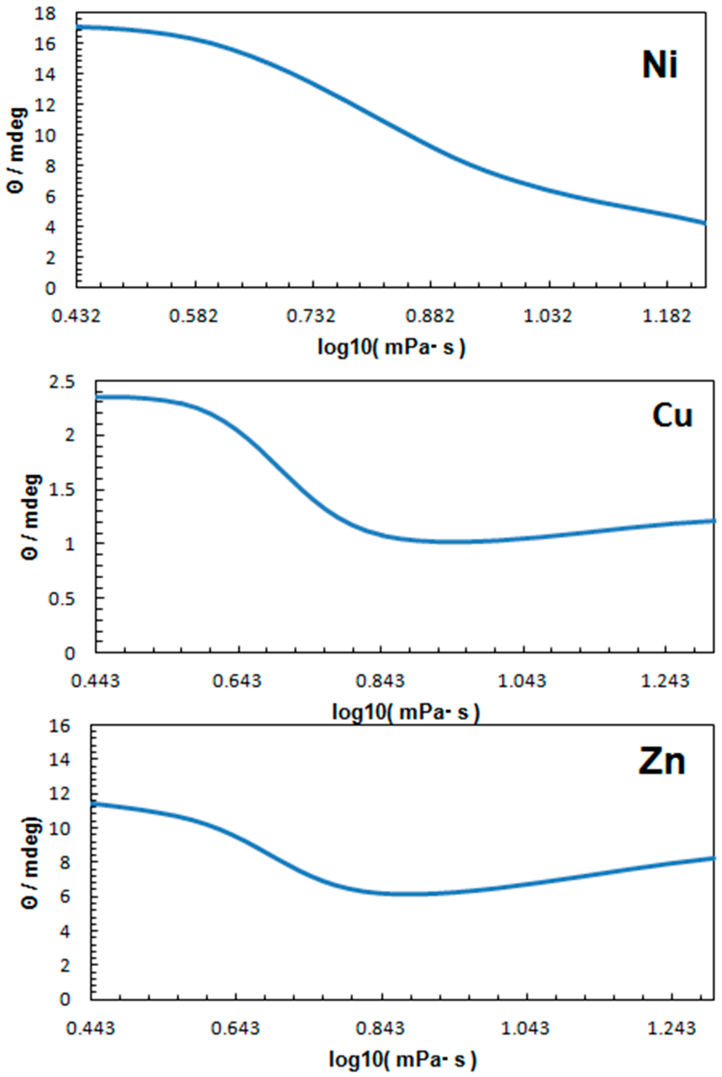 Previously, to elucidate intermolecular interactions, we designed metal complexes involving an electron-withdrawing (Br– or halogen) group, an UV absorbing and hydrophobic (Ph–) group, and a strong hydrogen-bonding (HO–) group to PMMA []. Here, we prepared new similar Ni(II), Cu(II), and Zn(II) complexes (abbreviated as Ni, Cu, and Zn, respectively) that enhance flexibility by inserting one more methylene chains between the Ph– group and the asymmetric carbon atom (Figure 1). We focused on the polarized light-induced molecular orientation control of the present complexes. In order to examine intermolecular interactions further, we employed concentration (viscosity) dependence of PMMA solutions and molecular modeling.