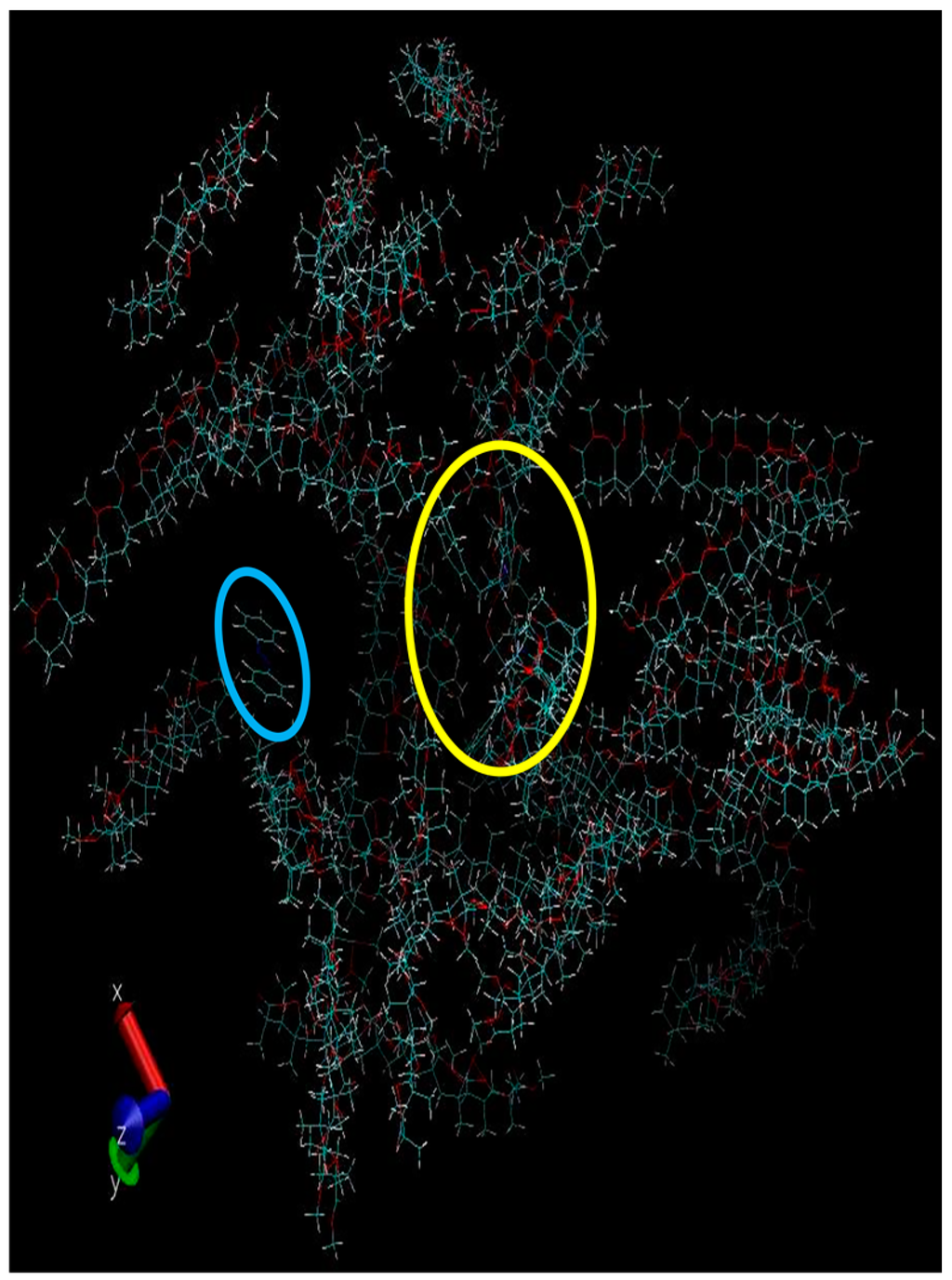 Molecular modeling of 2+AZ+PMMA. 2: yellow circle; AZ: blue circle.