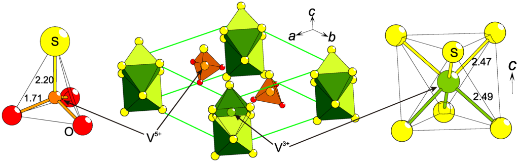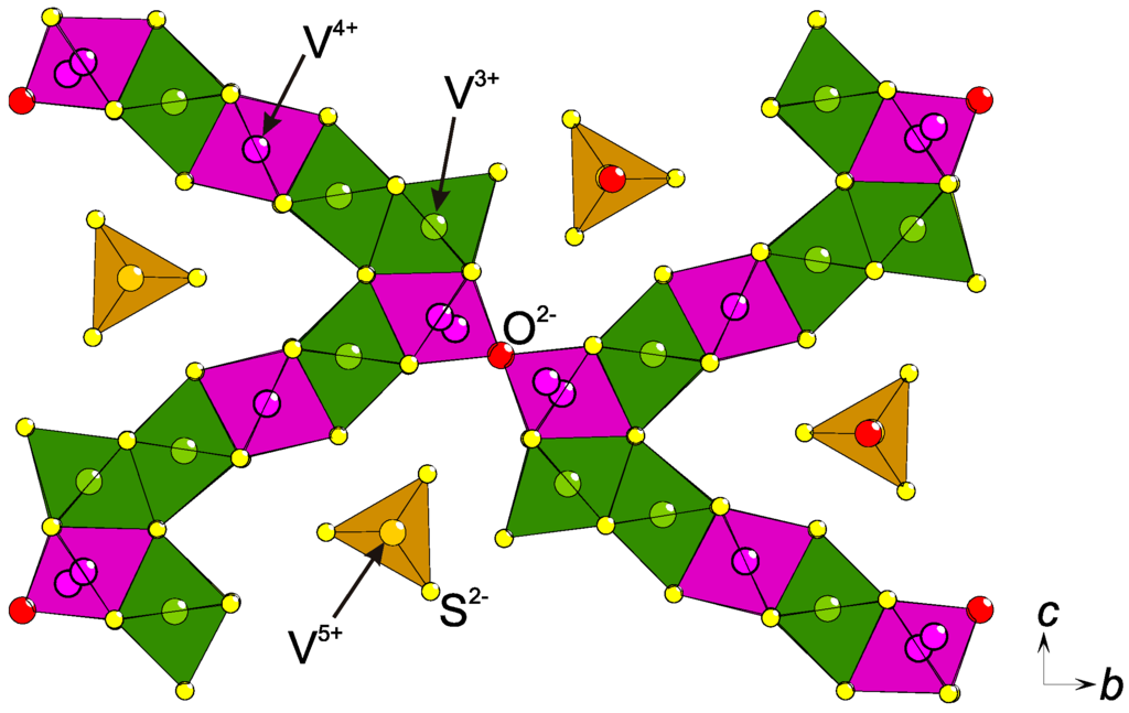 Part of the V−S−O lattice in the crystal structure of Ba15V12S34O3. The proposed charge ordering is emphasized with different colors: V3+ (green), V4+ (purple), and V5+ (yellow) []. At the V−O−V junction, both half-occupied split-positions of V are indicated.