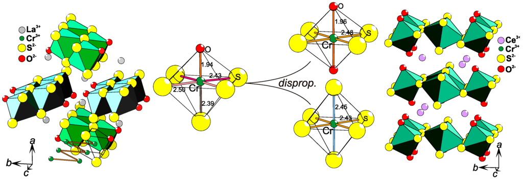 LaCrS2O is a quasi-1-D system with zig-zag chains of [CrS3/3S2/2O1/1]3− edge-sharing octahedra (Figure 6, left), where La3+ ions separate the chains. By introducing the slightly smaller lanthanide ion Ce3+ instead of La3+, the lattice experiences a so-called "chemical pressure". As a result, the crystal structure of CeCrS2O consists of layers (Figure 6, right) built from two different octahedra that are edge- and vertex-sharing and are separated by Ce3+ ions. The structural difference between the two chemically similar systems can be described as a coordination disproportionation: LaCrS2O contains only [CrS3/3S2/2O1/1]3− entities [] and CeCrS2O contains equal amount of [CrS4/2S2/3]7/3− and [CrS4/3O2/1]11/3− octahedra in an ordered fashion [] (Figure 6). As it is clearly not a charge ordering phenomenon, this might be related to coordination order entropy that is rarely taken into consideration. An alternative explanation would be that the 5+1 coordination in LaCrS2O is relatively unstable, as indicated by the fact that the highly symmetrical electron distribution on Cr3+ in an octahedron (3t2g0eg) does not agree with the relatively low symmetry of the Cr-site, i.e., four different bond lengths are found in the structure (Figure 6). Coordination disproportionation is also found in CeCrSe2O and even in LaCrSe2O [], leaving LaCrS2O as only example, so far, with homogeneous 5+1 coordination of Cr3+.