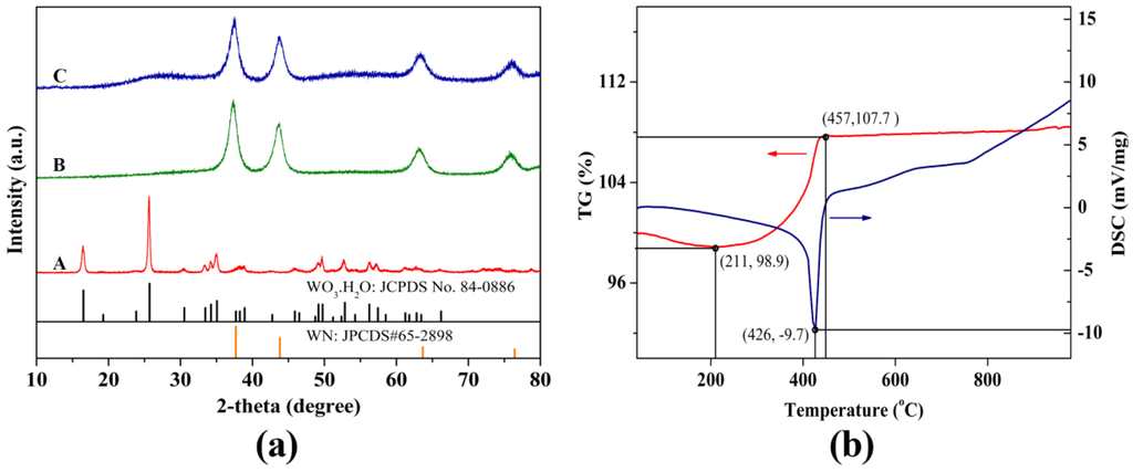 (a) Powder X-ray diffraction (XRD) patterns of tungsten oxide hydrate (WO3·H2O) A, tungsten nitride (WN) B and hybrid tungsten nitride and oxide (WN/WO3) composites C; (b) differential scanning calorimetry-thermal gravimetric analysis (DSC-TGA) curves of WN/WO3 composites.