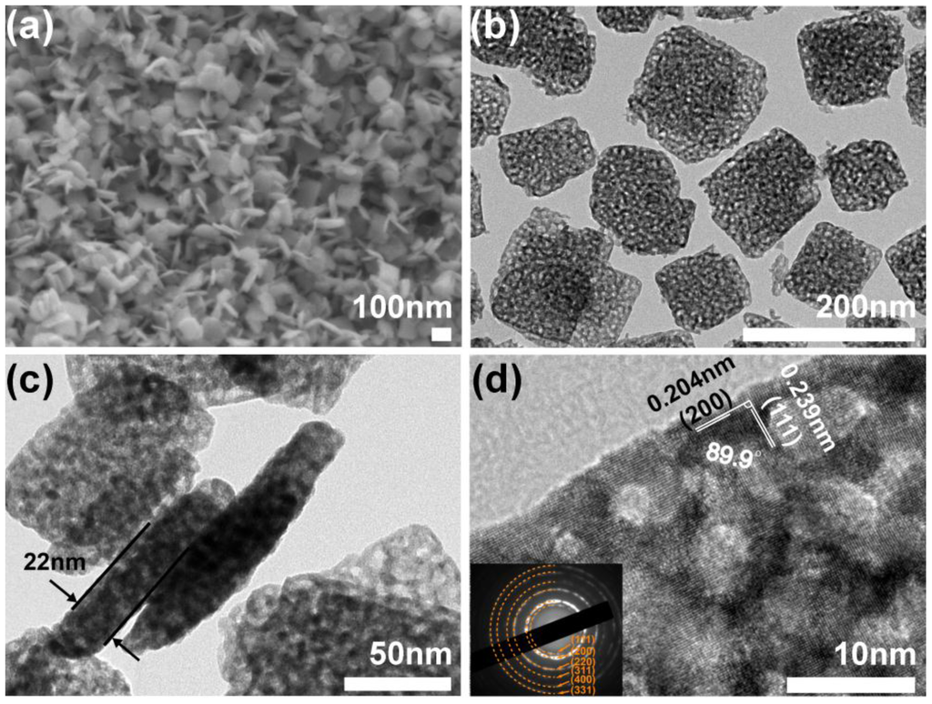 X-ray diffraction (XRD) analysis was conducted on a Rigaku MiniFlex 600 powder X-ray diffractometer (Rigaku Corporation, Tokyo, Japan) with Cu Kα radiation (λ = 1.5418 Å, accelerating voltage 40 kV, applied current 15 mA) at scanning rate of 1 °/min. Scanning electron microscopy (SEM) images were performed on a JSM-7800F (Japan Electron Optics Laboratory Co., Ltd., Tokyo, Japan) instrument (accelerating voltage 3.0 kV). Transmission electron microscopy (TEM) and high-resolution transmission electron microscopy (HRTEM) observations were conducted on an FEI TecnaiG2 F30 (Japan Electron Optics Laboratory Co., Ltd.). Differential Scanning Calorimetry (DSC) and thermal gravimetric analysis (TGA) were done on a NETZSCH/STA 449 F1 (Netzsch, Selb, Freistaat Bayern, Germany).