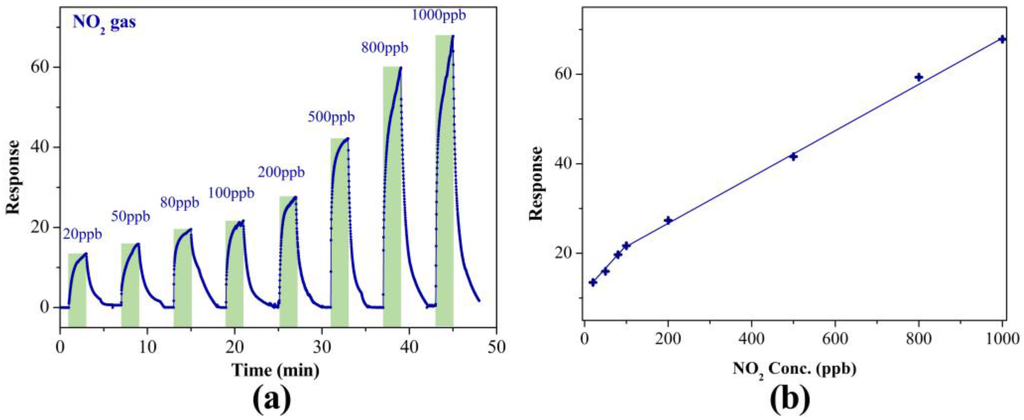 Dynamic sensing performance of WN/WO3 composites-based sensors to various concentrations of NO2 at room temperature is shown in Figure 3a. NO2 is an oxidizing gas, so when an NO2 molecule adsorbs on the surface of WN/WO3 composites, it captures electrons from the composites, resulting in the increase of resistance of the composites-based sensors upon exposure to NO2. Figure 3b plots the sensor response as a function of NO2 concentration, and shows that with an increase in NO2 concentration, the response of the sensor also exhibits an increasing trend. Interestingly, the sensitivities to NO2 concentrations from 5 to 100 ppb and 100 to 1000 ppb exhibit linear dependence, fitting well into two linear curves which have different slopes. It is well understood that electrical conductance shows strong dependence on carrier and mobility (σ = neμn, where n is the concentration of electrons, e is electronic charge, and μn is electron mobility), and that electrical resistivity is the reciprocal of electrical conductance. When the WN/WO3 composites sensor is exposed to low concentration of NO2, the amount of adsorbed NO2 is so sparse that the degradation of carrier could be almost negligible, and the response of the sensor exhibits a “high increase model”. However, when exposed to high concentration of NO2, the effect of NO2 adsorption will be enhanced, and the degradation of carrier mobility becomes relatively remarkable, resulting in a decrease in the rate of sensitivity increase under abundant NO2 adsorption [30]. The detection limit of the WN/WO3 composites sensor for NO2 is calculated to be approximately 1.28 ppb based on signal-to-noise ratio of 3 (see the Section “Calculation of Theoretical Limit of Detection Using Signal/Noise Ratio” in Supplementary Materials), which is far below the immediately dangerous to life or health (IDLH) values (NO2: 20 ppm) defined by the U.S. National Institute for Occupational Safety and Health (NIOSH). The recommended NO2 exposure limit defined by the NIOSH is 1 ppm [31].