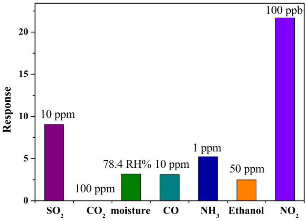 Selective detection of target gas from various interference gases is still an unsolved drawback for chemiresistive gas sensors [32]. The responses of the sensor based on WN/WO3 composites to common vehicle exhaust, including SO2, CO2, moisture, CO, NH3, ethanol and NO2, were measured to quantify the selectivity, which is shown in Figure 4. As clearly illustrated in Figure 4, the sensor shows a high response to NO2, which is more than 2 times higher than that for other interference gases, indicating the excellent selectivity to NO2 as opposed to other selected interference gases. The selective detection to NO2 gas might be due to the high reactivity and large electron affinity (2.28 eV) of NO2, in comparison with pre-adsorbed oxygen (0.43 eV) and other test gases [33]. In addition, the responses of the sensor based on WN/WO3 composites to 200 ppb NO2 at RT under different humidities were tested and the result is shown in Figure S1. It can be observed that, with increasing relative humidity, the response of the sensor decreases because of the competition between water molecules and NO2 molecules for the reacting sites [34]. However, the sensor shows a high response of 17.8 even at high humidity of 90 RH%.