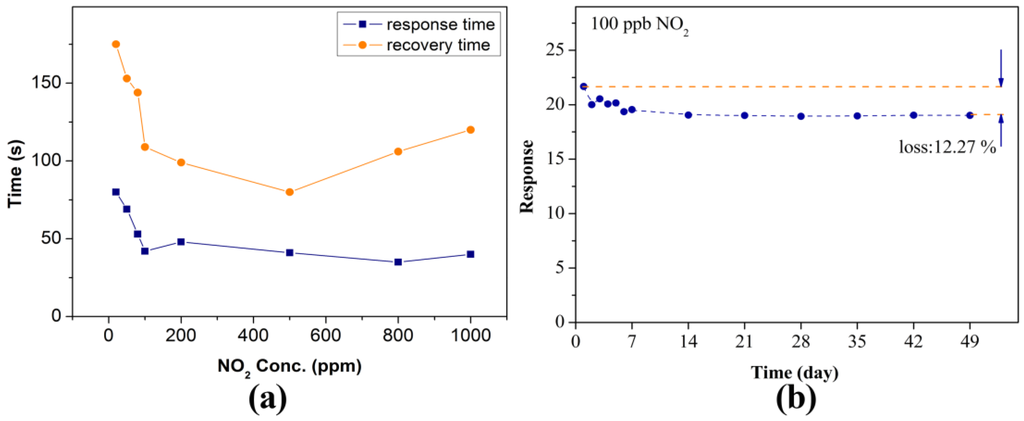 Figure 5a shows the response and recovery times of the WN/WO3 composites-based sensor. With increasing NO2 concentration, the response time and recovery time both experience a decrease. The reason why the response and recovery times are substantially longer at low concentration is unclear and needs further study. The following can be considered as a plausible explanation. At low concentration of ambient NO2, the NO2 molecules occupy a lower percentage of air relative to oxygen molecules, so the probability of NO2 molecules arriving and being captured by the surface of the sensing materials (WN/WO3) is relatively smaller, resulting in a long response. When the concentration of NO2 increases, the probability of NO2 molecules arriving and being captured by the surface of sensing materials becomes higher, decreasing the response time. As for the recovery time: at low concentration of NO2, the amount of adsorbed NO2 is too small, making it difficult to desorb completely, resulting in a relatively longer recovery time. When the concentration is higher, the concentration difference between the surface of WN/WO3 and ambient atmosphere is large enough to desorb NO2 molecules quickly, reducing the recovery time. Similar observations have also been reported by other investigators [35,36]. In addition, the sensor shows excellent reversibility properties with a response time of less than 80 s and a recovery time of less than 180 s, regardless of the NO2 concentration. Stability is another key quality indicator in the development of gas sensors for real markets. Thus, we measured the response of the WN/WO3 composites-based sensor for 7 weeks, once a day (every 24 h) at room temperature for a week and then once a week for 6 weeks, shown in Figure 5b. We can observe that the sensor experiences a loss in response of less than 12.27% after 7 weeks of aging. The response of the sensor comes into saturation after 2 weeks. The results indicate that the WN/WO3 composites sensor exhibits good long-term stability.