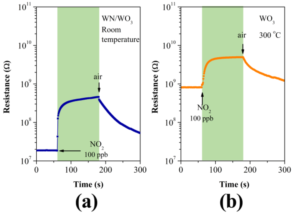 Dynamic sensing transients to 100 ppb NO2 of (a) WN/WO3 composite nanosheets sensors at room temperature; and (b) WO3 nanosheets sensors at 300 °C.