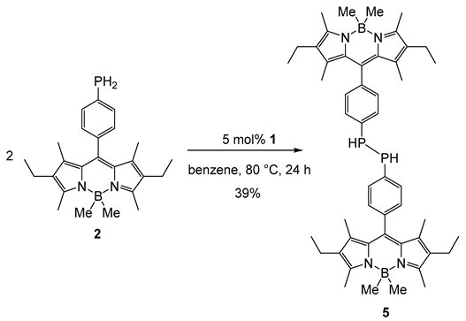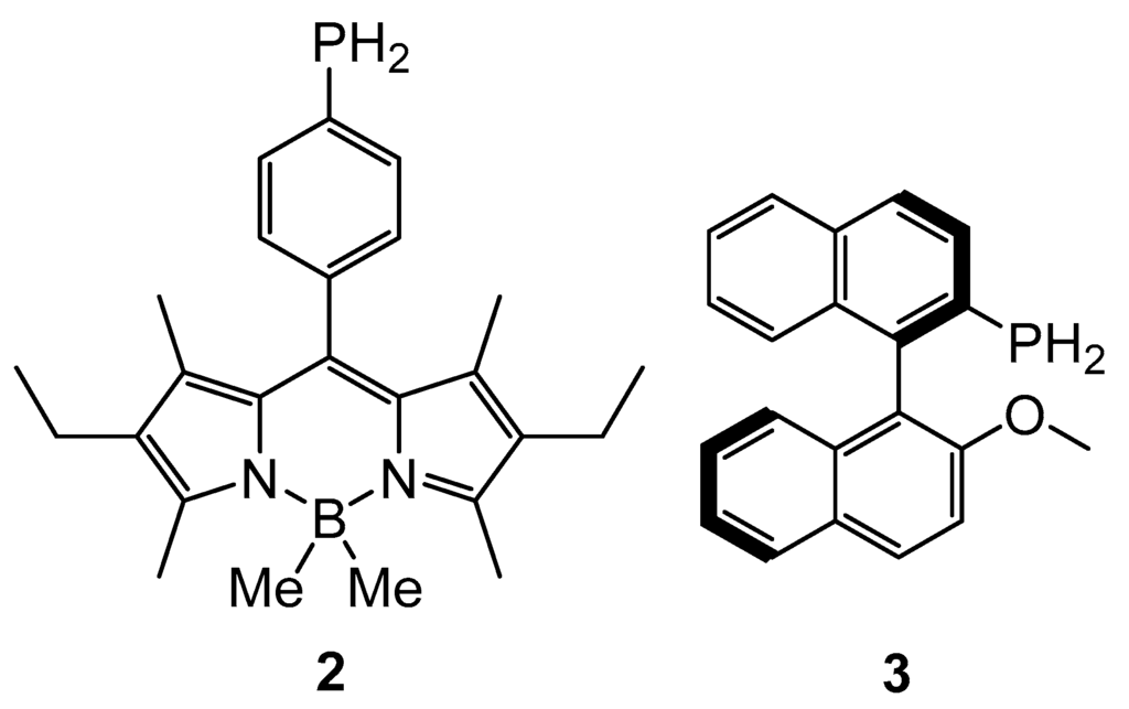 Primary phosphines can be difficult to handle due to toxicity and facile oxidation that renders many simple derivatives pyrophoric. A vigorous effort to understand and expend the family of air-stable primary phosphines emerged in recent years to avail greater use of these molecules [12,13,14,15]. Among this class of primary phosphines are 8-[(4-phosphino)phenyl]-4,4-dimethyl-1,3,5,7-tetramethyl-2,6-diethyl-4-bora-3a,4a-diaza-s-indacene (2) [12,15,16,17,18] and (2′-methoxy-[1,1′-binaphthalen]-2-yl)phosphine (3) [19,20] (Figure 1). Preliminary reactivity studies of 2 indicate that the air stability does not impact the reactivity at phosphorus.