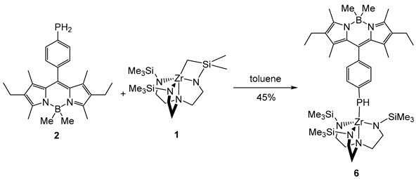 All air-sensitive manipulations were performed under a positive pressure of nitrogen using standard Schlenk techniques or in an M. Braun glovebox. Benzene-d6 was degassed and dried over NaK alloy. Starting materials [κ5-N,N,N,N,C-(Me3SiNCH2CH2)2NCH2CH2NSiMe2CH]Zr (1) [8] and 8-[(4-phosphino)phenyl]-4,4-dimethyl-1,3,5,7-tetramethyl-2,6-diethyl-4-bora-3a,4a-diaza-s-indacene (2) [16] were prepared according to literature procedures. All other chemicals were obtained from either Alfa Aesar (Ward Hill, MA, USA) or Sigma-Aldrich (St. Louis, MO, USA) and dried by appropriate means. NMR spectra were collected on a Bruker AXR 500 MHz spectrometer (Bruker, Billerica, MA, USA) in benzene-d6 solution and are reported with reference to residual solvent signals (e.g., benzene-d6, δ 7.16 and 128.0) or to an external standard of 85% H3PO4 (δ 0.0) for 31P NMR spectra. Conversions are determined by integration of the 31P{1H} NMR spectra. Pulse sequences for 31P NMR spectra that are suitable for integration have been reported [4]. Absorption spectra were recorded with a QuantaMaster 4 fluorescence spectrophotometer (PTI, Edison, NJ, USA) as THF solutions. Samples were excited at 485 nm with excitation and emission slits each set to 1 nm. IR data were collected on a Shimazdu IRAffinity-1 FTIR spectrometer (Shimadzu, Kyoto, Japan).