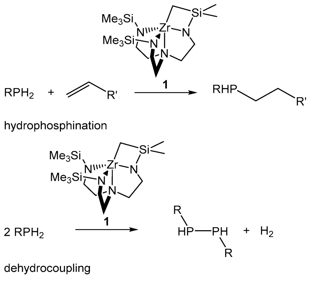 Construction of P–E bonds to form novel organophosphines is of intense, ongoing interest [1]. The goal of P–E bond formation in a selective, atom-economical, and efficient manner has motivated efforts in two principal catalytic approaches: hydrophosphination to make P–C bonds [2] and dehydrocoupling to make P–P bonds [3]. Pursuant to both approaches, we have demonstrated hydrophosphination [4,5,6] and dehydrocoupling [7,8,9] of primary phosphine substrates with [κ5-N,N,N,N,C-(Me3SiNCH2CH2)2NCH2CH2NSiMe2CH]Zr (1) [8] (Scheme 1) where phosphide compounds (i.e., (N3N)ZrPHR; N3N = N(CH2CH2NSiMe3)33−) are key intermediates.