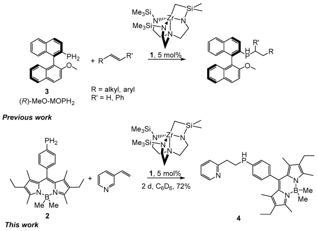 In summary, the fluorescent primary phosphine 8-[(4-phosphino)phenyl]-4,4-dimethyl-1,3,5,7-tetramethyl-2,6-diethyl-4-bora-3a,4a-diaza-s-indacene (2) readily engages in P–P and P–C bond formation via catalytic dehydrocoupling and hydrophosphination. Catalytic hydrophosphination with 1 selects for formation of the anti-Markovnikov secondary phosphine hydrophosphination product with no detectable formation of tertiary or Marknonikov addition products. Insertion of 2 into the zirconium pre-catalyst 1 results in the formation of the zirconium phosphido complex 6, which is highly related to a broader family of zirconium phosphide complexes.