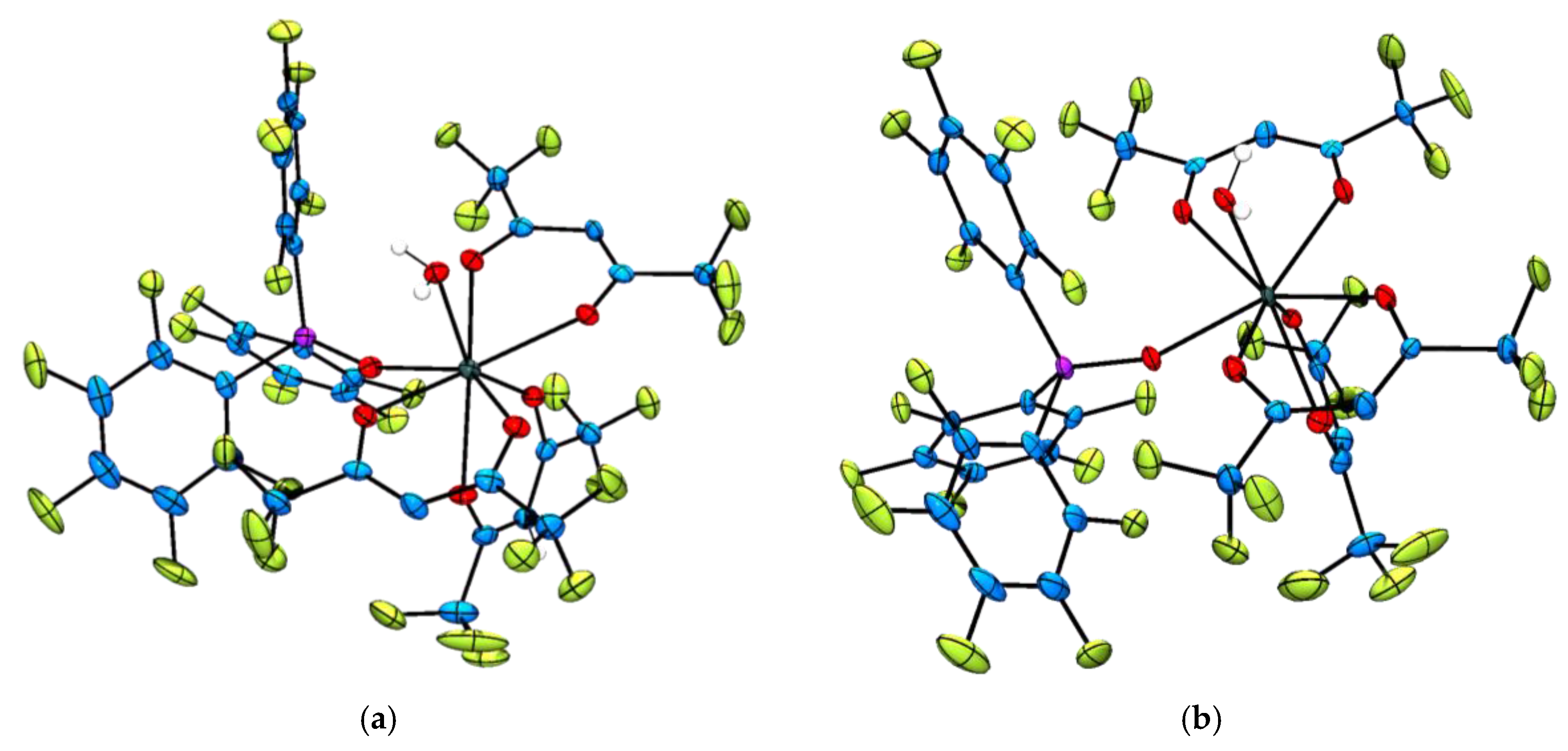 The molecular structures of the two hfac complexes [Ln(hfac)3{(ArF)3PO}(H2O)] (Ln = Tb3+, 3 and Er3+, 4) are isostructural and the lanthanide(III) ions are octacoordinated by three bidentate hfac ligands, one monodentate perfluorinated triphenylphosphine oxide and one water molecule (Figure 1). The coordination geometries at the lanthanide centres are best described as distorted square antiprismatic with two hfac ligands occupying one square plane and the third hfac, the phosphine oxide and coordinated water molecule describing the second square plane. The average hfac–oxygen–Tb3+ and hfac–oxygen–Er3+-bond distances are 2.383(3) and 2.357(5) Å respectively and lie in the range of bond distances previously reported [40,47]. Similarly, the (ArF)3PO–Tb3+ and (ArF)3PO–Er3+ bond distances of 2.314(3) and 2.284(5) Å compare well to those reported for the complex [Er(hfac)3{(ArF)3PO}2] (ave. = 2.323(4) Å) [34] and the Tb3+–OH2 and Er3+–OH2 bond distances are measured as 2.377(3) and 2.337(5) Å respectively, which are similar to the Ln–OH2 bond distances commonly measured in trivalent lanthanide complexes of DOTA; range = 2.590 Å ([CeDOTA]−) to 2.355 Å ([YbDOTA]−), (DOTA = 1,4,7,10-tetraazacyclododecane-N′,N″,N′′′,N′′′′-tetraacetic acid) [48].