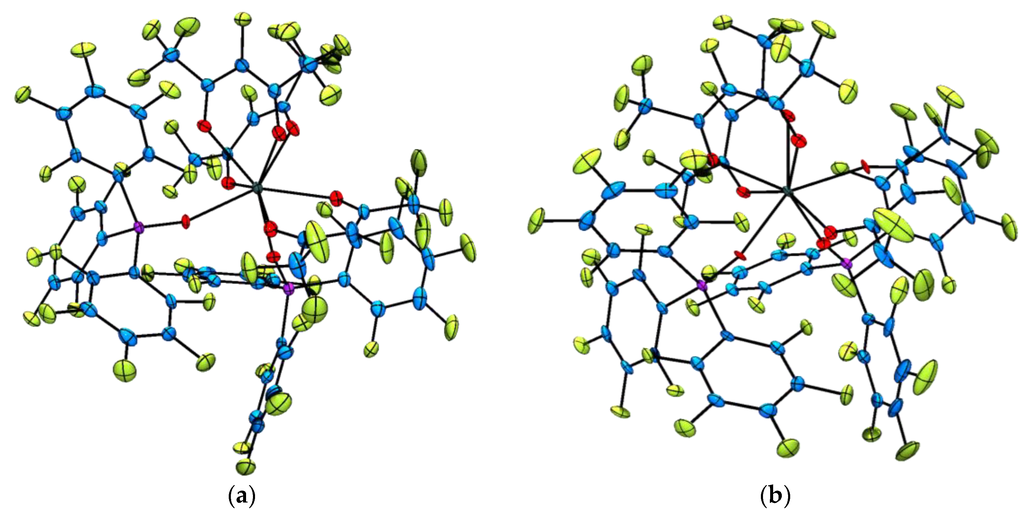 X-ray diffraction data for compounds 3, 6, 7, and [Tm(F7-acac)3{(ArF)3PO}2]) were collected using an Rigaku Oxford Diffraction Xcalibur, Sapphire2 diffractometer (Rigaku, Tokyo, Japan), utilising graphite-monochromated Mo Kα X-ray radiation (λ = 0.71073 Å); compounds 9 and 10, or on a Bruker X8 Prospector diffractometer (Bruker, Billerica, MA, USA) utilising graphite-monochromated Cu Kα X-ray radiation (λ = 1.54178 Å) and compound 4 on a Bruker AXS SMART diffractometer (Bruker, Billerica, MA, USA) using graphite-monochromated Mo Kα X-ray radiation (λ = 0.71073 Å). Data were corrected for Lorentz and polarisation factors and empirical absorption corrections applied [56,57]. Crystal data, data collection and structural refinement parameters are given in Table S1. The structures were solved by direct methods using the program SHELXT [58] or OLEX-2 [59]. Full matrix refinement on F2 and all further calculations were performed using OLEX-2 or ShelXL [58]. The non-H atoms were refined anisotropically and hydrogen atoms were positioned in idealised sites and were allowed to ride on their parent C or N atoms.