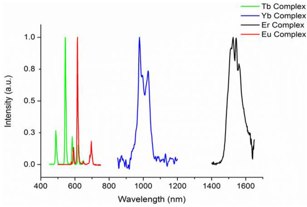 - Liao, Z.; Tropiano, T.; Mantulnikovs, K.; Faulkner, S.; Vosch, T.; Sørensen, T.J. Spectrally resolved confocal microscopy using lanthanide centred near-IR emission. Chem. Commun. 2015, 51, 2372–2375. [Google Scholar] [CrossRef] [PubMed]