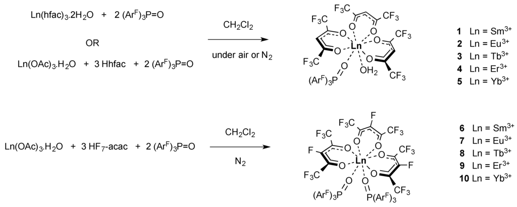 A series of lanthanide tris hexafluoroacetylacetonate (hfac) and heptafluoroacetylacetonate (F7-acac) bis perfluorinated tris aryl phosphine oxide complexes were originally targeted by two synthetic routes as outlined in Scheme 1. Either treatment of prepared Ln(hfac)3·2H2O [28] with two equivalents of (ArF)3PO (tris(pentafluorophenyl)phosphine oxide) in CH2Cl2 at room temperature sonicated for one hour or a one pot reaction of the corresponding lanthanide acetate, protonated β-diketonate and two equivalents of (ArF)3PO [41] at 2 × 10−3 M concentrations heated to reflux temperature for one hour yielded the complexes [Ln(hfac)3{(ArF)3PO}(H2O)] and (ArF)3PO (Ln = Sm3+, Eu3+, Tb3+, Er3+ and Yb3+, 1–5) and [Ln(F7-acac)3{(ArF)3PO}2] (Ln = Sm3+, Eu3+, Tb3+, Er3+ and Yb3+, 6–10) in moderate yields (26%–59%) after recrystallization from CH2Cl2 solutions (as verified by single crystal X-ray diffraction analysis). Interestingly, conducting the reactions in dry CH2Cl2 under air sensitive conditions at higher concentrations (1 × 10−2 M) in order to promote bis phosphine oxide substitution with the labile coordinated water molecules in the parent lanthanide acetate or β-diketonate complexes, resulted solely in the isolation of the mono phosphine oxide substituted complexes for the hexafluorinated β-diketonate hfac [47], whereas only the bis phosphine oxide substituted derivatives were isolated with the heptafluoro β-diketonate F7-acac using both standard and dry solvents in similar conditions (Scheme 1). This interesting divergence in reactivity can be attributed to the greater electron withdrawing effects of the F7-acac ligand relative to the hfac β-diketonate which promotes a higher affinity for the second phosphine oxide to bind to the electropositive lanthanide(III) metal centres. In the case of the hfac reactions, adjusting the stoichiometry of the phosphine oxide accordingly, resulted in slightly improved product yields in most cases apart from complex 4 (44%–53%).