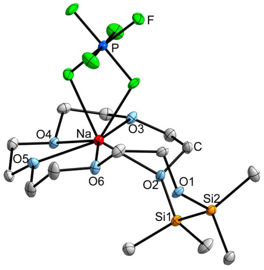 By an analogous reaction of NaPF6 with 1,2-disila[18]crown-6, single crystals in form of colorless blocks were obtained from dichloromethane/benzene (2:1). [Na(1,2-disila[18]crown-6)PF6] (2) crystallizes in the triclinic space group P as a monomeric contact ion pair (Figure 3). Na+ is coordinated by five of the six crown ether O atoms and additionally by two F atoms of the PF6 anion. The coordination sphere of Na+ cannot be assigned to a hitherto described polyhedron as a result of its strong distortion. Compared to K+, the ionic radius of Na+ is still too small for the cavity diameter of 1,2-disila[18]crown-6. As a result, O1 is with a distance of 453.2(3) pm not participating in the coordination of the metal ion. This leads to a strong distortion of the ring system, as O1 is located significantly beneath the mean plane of the other crown ether O atoms. Additionally, the Me groups at the Si atoms show a staggered arrangement, which is the common structure in free hybrid crown ethers []. In the case of Compound 2, the electrostatic attraction between O1 and Na+ apparently does not compensate for the adoption of an ecliptic arrangement, so the cation is preferably coordinated by the C-bonded O atoms. The coordinating Si- and C-linked O atom O2 establishes a bond length of 238.5(3) pm to the metal, while the completely C-linked O atoms show values between 237.0(3) and 247.3(2) pm. The 29Si{1H}-NMR signal of Compound 2 appears at δ = 14.3 ppm and, according to the respective Lewis acidity of Li+ and Na+, is less low-field shifted compared to 1.