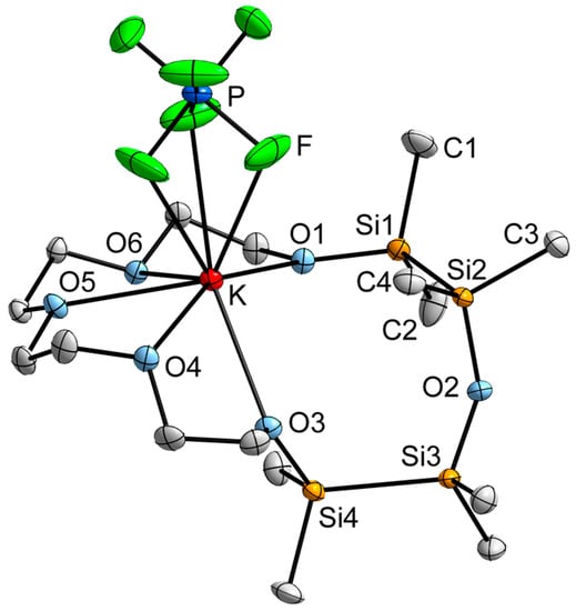 As observed in the Na+ complex 2, Compound 4 is a monomeric contact ion pair (Figure 4). The cation is coordinated by five of the six crown ether O atoms and three F atoms of the anion, giving a coordination number of eight. The incorporation of two disilane units into the ring system leads to an increased ring diameter so that K+, which commonly matches perfectly with [18]crown-6, has a too small ionic radius for the ligand 3. The inorganic part sticks out, showing an interatomic distance of 505.5(2) pm between the completely Si substituted O atom O2 and the metal ion. The Me groups at the Si atoms adopt an approximately staggered conformation with average dihedral angles of 84.2(2)° at Si1/Si2 and 59.8(2)° at Si3/Si4. Worth mentioning is the unusual orientation of Si4: In all hitherto known sila-crown ether complexes, the Si atoms bonded to coordinating O atoms are approximately arranged in plane with the crown ether O atoms [,,,,,,]. In contrast to this, Si4 is considerably located beneath the mean plane of the coordinating O atoms. The Si/C-bonded O atoms O1 and O3 show O–K bond lengths of 283.8(2) and 279.4(2) pm, whereas the fully C-substituted O atoms O4–O6 establish average bond lengths of 273.7(2) pm. It can therefore be assumed that K+ is stronger coordinated by the carbon-based part of the hybrid crown ether 3. Compared to [K(1,2-disila[18]crown-6)PF6], which incorporates only one disilane unit and in which all crown ether atoms are participating in the coordination, the mean O–K bond lengths are in 4 considerably shorter []. This can be related to the coordination number of 8 in 4 compared to 9 in [K(1,2-disila[18]crown-6)PF6]. The Si2–O2–Si3 bond angle is 143.8(1)°, this is a typical value for siloxanes [,]. Also the Si4–O3–C9 bond angle of 123.3(2)° is in the expected range [,]. Only the Si1–O1–C16 angle is with 117.8(1)° smaller than usually observed and is similar to that found in C–O–C bindings, e.g., C14–O6–C15 with 112.3(2)°.