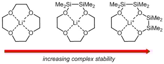 The nature of the Si–O bond has been intensively studied over the past six decades. In the 1960s especially, the large valence angle in disiloxanes and the unusual short Si–O bond length, e.g., in O(SiH2Me2)2, were issued in numerous publications [,]. The low basicity of siloxanes was originally attributed to an electron-withdrawing tendency of the silyl groups of the type p(O)→d(Si) [,,]. This approach was later discarded in favor of hyperconjugation interactions between p(O)→σ*(Si–C) [,,]. Alternatively, in an opposed model based on calculations of the electron density function, the Si–O bond was described as essentially ionic due to the high difference in electronegativity between Si and O [,]. Careful theoretical studies on the basicity of O(SiH2Me2)2 and OEt2 revealed that the lower electrostatic attraction in siloxanes results from the repulsion between the positively charged Si atoms and Lewis acids []. This proceeding has recently been extended on cyclosiloxanes [], which were previously described as pseudo crown ethers or inorganic crown ethers [,,]. However, the structural analogy to organic crown ethers is poor, since siloxanes feature O atoms linked by –SiMe2– rather than –CH2CH2–. Additionally, organic ring-contracted crown ethers exhibit an eminently reduced coordination ability, as has been shown in the referencing of [17]crown-6, in which only one –CH2CH2– unit was replaced by –CH2– [,]. Consequently, higher comparability between organic crown ethers and cyclosiloxanes can be provided by extension of the –SiMe2– unit to –SiMe2SiMe2–. Recent studies of hybrid [12]crown-4 featuring one or two disilane fragments in a residuary organic crown ether framework revealed an increasing coordination ability towards Li+ in the series C–O–C < C–O–Si < Si–O–Si (Scheme 1) [,].