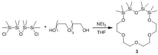 The synthesis of hybrid crown ethers with a higher amount of disilane units was very recently described for 1,2,4,5-tetrasila[12]crown-4 []. In an analogous reaction of O(Si2Me4Cl)2 with tetraethylene glycol, the ligand 1,2,4,5-tetrasila[18]crown-6 (3) was synthesized using high dilution of the agents to prevent polymerization (Scheme 3). Compound 3 is a highly viscous, colorless oil. Through the presence of two disilane units, the ring size is further increased in comparison to 1,2-disila[18]crown-6. In the 29Si{1H}-NMR spectrum, Compound 3 shows two signals which can be assigned to the two types of Si atoms: The Si–O–Si entity appears at δ = 2.1 ppm, the C–O–Si entity is low-field shifted and appears at δ = 11.0 ppm.