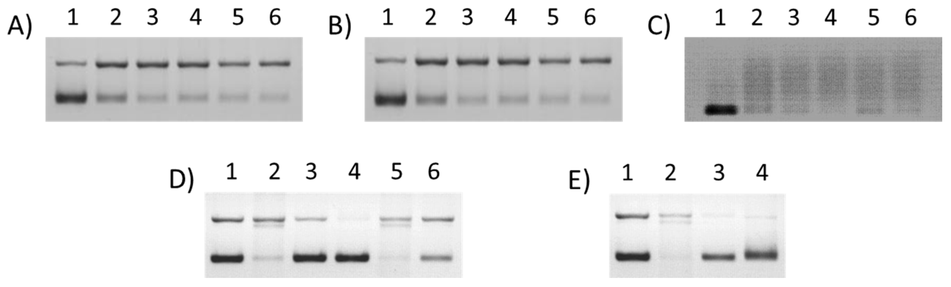 Plasmid DNA (pUC19) was purchased from Invitrogen (Carlsbad, CA, USA). The DNA cleavage activity of 3 was determined by monitoring the conversion of supercoiled plasmid DNA (form I) to nicked circular DNA (form II) in Tris-HCl buffer (5 mM, pH 7.4), using agarose-gel electrophoresis. To probe the effect of compound concentration on cleavage, solutions containing DNA (100 ng) and 3 (0–20 μM), with a total reaction volume of 20 μL, were incubated at 37 °C for 20 h. To determine the oxidative cleavage mechanism, solutions containing DNA (100 ng), 3 (10 μM), and various radical scavenges (10 or 40 mM of KI, DMSO, tBuOH, and NaN3), with a total reaction volume of 20 μL, were incubated at 37 °C for 20 h. Reactions were also conducted in the presence of 10 equivalents of ascorbic acid or glutathione, and in the presence of methyl green (50 µM) and DAPI (50 µM). After incubation, loading buffer (5 μL, containing 0.25% bromophenol blue, 0.25% xylene cyanol, and 60% glycerol) was added and reaction mixtures were immediately loaded onto a 1% agarose gel containing ethidium bromide (1.0 mg·mL−1). The DNA fragments were separated by applying 60 V for 2 h in Tris-acetate EDTA (TAE) buffer. The DNA bands were analyzed under UV light using a Fujifilm Image Reader LAS-3000 (Tokyo, Japan).