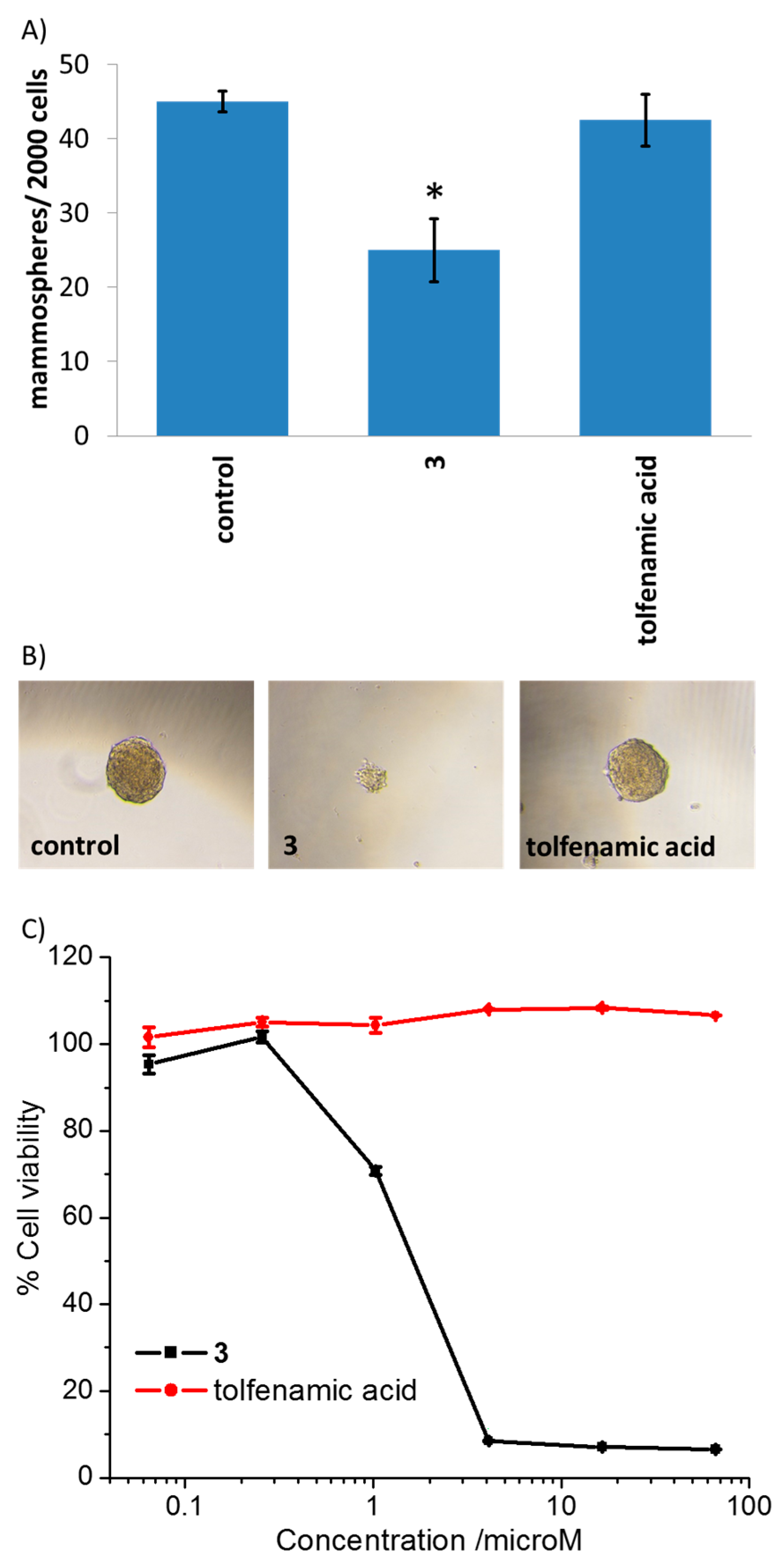 (A) Quantification of mammosphere formation with HMLER-shEcad cells untreated and treated with 3 or tolfenamic acid (at their IC20 values, 5 days). Error bars represent standard deviations and Student’s t-test, * p < 0.05. (B) Representative bright-field images (×10) of HMLER-shEcad mammospheres in the absence and presence of 3 or tolfenamic acid (at their IC20 values, 5 days). (C) Representative dose–response curves for the treatment of HMLER-shEcad mammospheres with 3 or tolfenamic acid after 5 days of incubation.