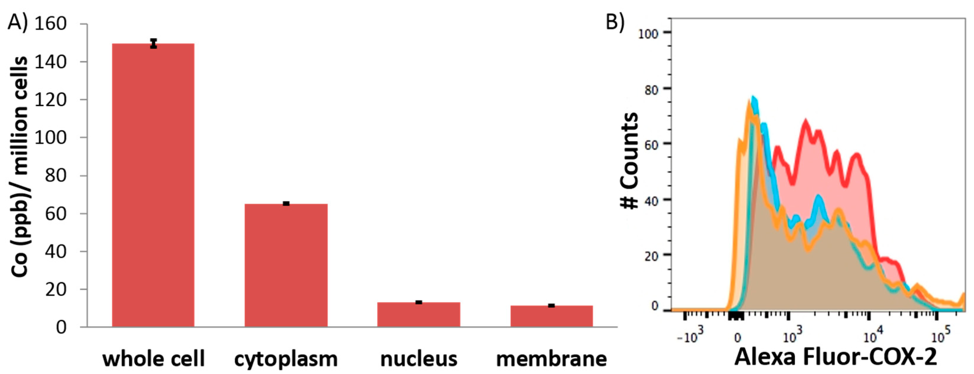 (A) Cobalt content in whole cell, cytoplasm, nucleus, and membrane fractions isolated from HMLER-shEcad cells treated with 3 (0.5 μM for 16 h). (B) Representative histograms displaying the green fluorescence emitted by anti-COX-2 (cyclooxygenase-2) Alexa Fluor 488 nm antibody-stained HMLER-shEcad cells treated with lipopolysaccharide (LPS) (5 μM for 24 h) (red) followed by 48 h in media containing 1 (0.125 µM: blue and 0.5 µM: orange).