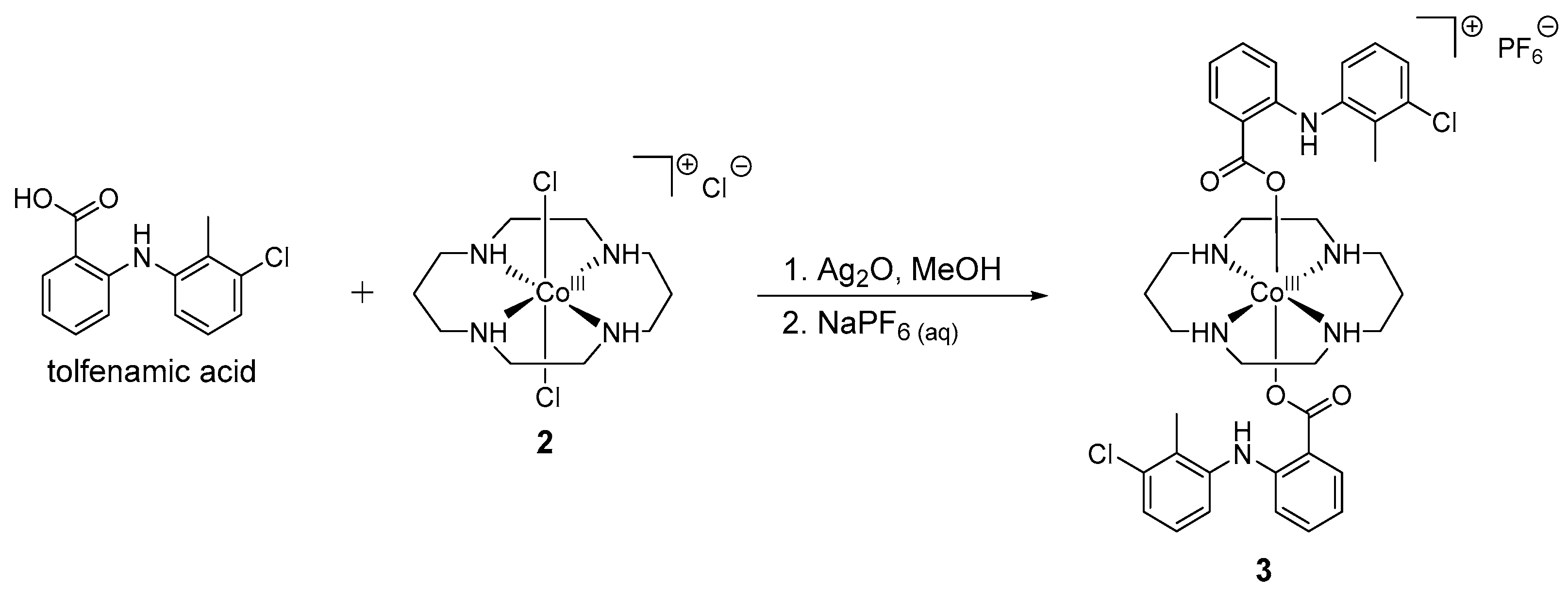 The reaction scheme for the preparation of the novel cobalt(III)–cyclam complex, 3, from trans-dichloro(cyclam)–cobalt(III) chloride, 2, and tolfenamic acid.