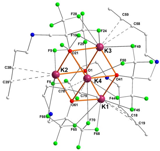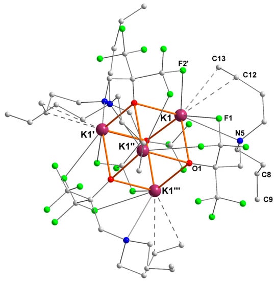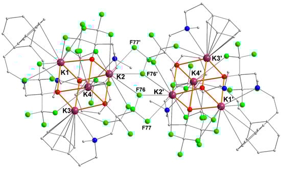 The compound [{RO1}K] crystallized as the distorted cubane [{RO1}K]4 ([1]4), a multinuclear structure typical of potassium alkoxides (Figure 1) [6,18,28,29]. Two K4O4 cuboid motifs are associated through bridging K···F interactions to generate a centrosymmetric macromolecular edifice containing eight potassium ions. The distances to the bridging fluorine atoms K2–F76′ (2.963(1) Å), K2–F76 (3.171(1) Å), and K2–F77′ (3.279(2) Å) are well below the sum of van der Waals radii for potassium (2.75 Å) and fluorine (1.47 Å), testifying to substantial interactions. They are also below the accepted distance for significant K–F interactions (ca. 3.40 Å) [30].