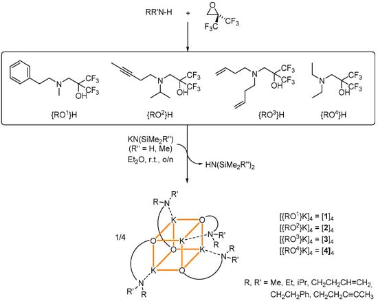 The fluoroalcohols {RO1}H–{RO4}H bearing two strongly electron-withdrawing CF3 groups in α position to the hydroxyl can be prepared in high yield by treatment of 2,2-bis(trifluoromethyl)oxirane with the appropriate amine in Et2O [16,20]. They were reacted with an equimolar amount of the potassium precursors [KN(SiMe3)2] or [KN(SiMe2H)2] to afford the corresponding potassium fluoroalkoxides in 33%–85% isolated (non-optimized) yields (Scheme 1). The resulting compounds [{ROx}K]4 were obtained as colorless, analytically pure solids (x = 1, [1]4; x = 2, [2]4; x = 3, [3]4; x = 4, [4]4). They all crystallized as tetranuclear complexes in a K4O4 cubane arrangement (vide infra). Their composition was established by X-ray crystallography and was corroborated by NMR spectroscopy. Their purity was confirmed by combustion analyses. All complexes are soluble in common organic solvents, including aliphatic hydrocarbons.
