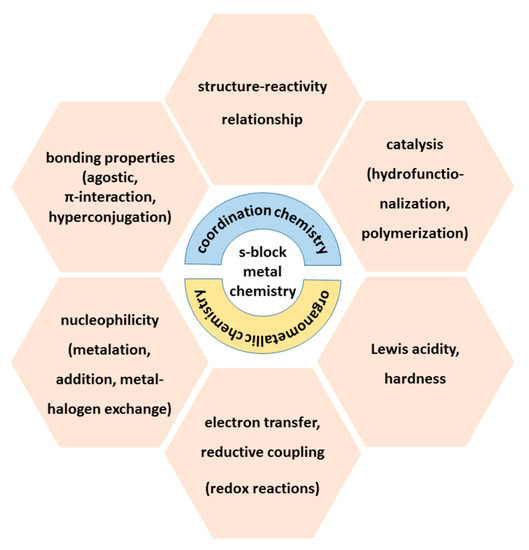 In very recent years, the interest in the chemistry of the s-block metals has gained tremendously in importance due to increased environmental and ecological awareness and, hence, the need for non-toxic reagents with a broad diversity of properties with respect to availability, reactivity, applicability, and costs has become evident. This fact led to the increasing impact of this chemistry in all fields of chemistry (Figure 1), especially in organometallic and catalytic applications [15,16]. Thus, the delayed development of a sophisticated organic [17] and coordination chemistry of calcium [18] led to the nickname of "sleeping beauty" for this dormant element [18,19]. Lithium (and to a lesser extend sodium and magnesium) will become the foundation for car batteries, ensuring electric-based transport and, hence, the demand (as well as the price) will increase significantly. Recent studies have elucidated the suitability of magnesium hydrides as storage materials for hydrogen, one of the future energy carriers. In the recent past, increasing efforts have been undertaken to develop a sophisticated chemistry of these elements [19,20,21]. The chemistry of methanediides [22] and the relevance of secondary interactions [23], discussed in this Special Issue, may be viewed as representative examples.
