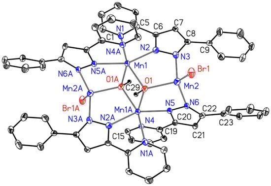 Molecular structure and numbering scheme of [Mn4(Br)2(µ3-OMe)2(2-PyPzPh)4] (3a). The ellipsoids represent a probability of 30%, H atoms are neglected for clarity reasons.