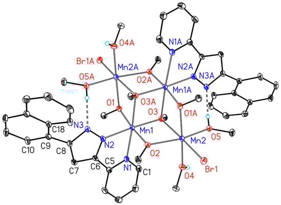 Molecular structure and numbering scheme of [(MeOH)4Mn4(Br)2(OMe)6(2-PyPzNaph)2] (3b). The ellipsoids represent a probability of 30%, H atoms are omitted for the sake of clarity with the exception of those of the ligated methanol molecules.