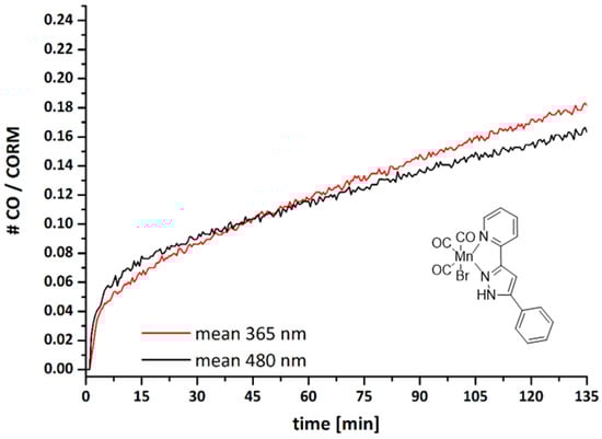 Carbon monoxide release kinetics upon illumination of crystalline [(OC)3Mn(Br)(2-PyPzPh)] (2a) at 365 nm (red) and at 480 nm (black).
