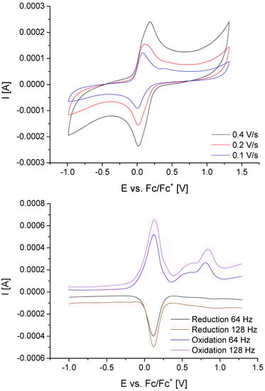 Electrochemical data were obtained by cyclic voltammetry using a conventional single-compartment three-electrode cell arrangement in combination with a potentiostat “AUTOLAB, eco chemie”. As electrodes, the following were used: auxiliary electrode (0.196 cm2 Pt disk electrode), working electrode (glassy carbon), and Ag/AgCl reference electrode (Ag/AgCl (LiCl sat.)). The Ag/AgCl electrode comprised a AgCl coated Ag wire in the same electrolyte solution, separated from the solution by a frit, and was prevent leakage of Ag+ ions into the solution. The measurements were carried out in anhydrous and nitrogen purged acetonitrile with 0.1 M terabutylammonium tetrafluoroborate (recrystallized twofold) as supporting electrolyte and analyt concentration of 3 × 10−4 mol/L. All potentials are referenced by the ferrocenium/ferrocene couple (E(Fc/Fc+) = 0.48 V). All experiments were performed at room temperature.