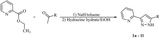 - Schowtka, B.; Müller, C.; Görls, H.; Westerhausen, M. Synthesis, Structures and Spectroscopic Properties of 3-Aryl-5-(2-pyridyl)pyrazoles and Related Pyrazoles. Z. Anorg. Allg. Chem. 2014, 640, 916–925. [Google Scholar] [CrossRef]