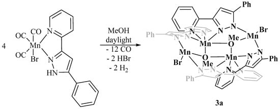 Degradation of [(OC)3Mn(Br)(2-PyPzPhH)] (2a) at daylight and room temperature in methanol yielding [Mn4(Br)2(OMe)2(2-PyPzPh)4] (3a).