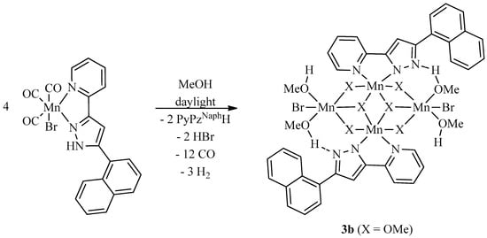 Degradation of [(OC)3Mn(Br)(2-PyPzNaphH)] (2b) at daylight and room temperature in methanol yielding [(MeOH)4Mn4(Br)2(OMe)6(2-PyPzNaph)2] (3b).