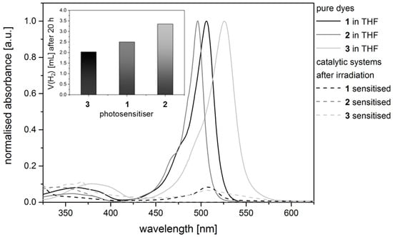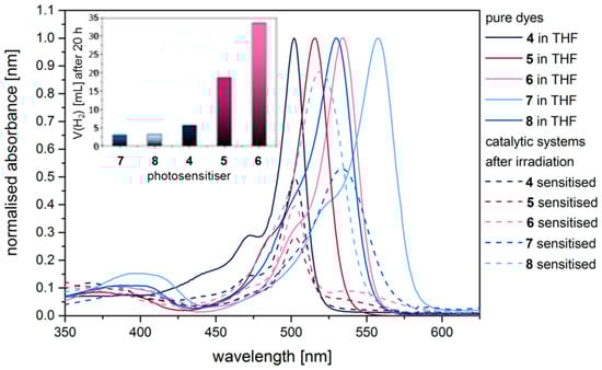 - Dura, L.; Ahrens, J.; Pohl, M.-M.; Höfler, S.; Bröring, M.; Beweries, T. Design of BODIPY Dyes as Photosensitisers in Multicomponent Catalyst Systems for Light-Driven Hydrogen Production. Chem. Eur. J. 2015, 21, 13549–13552. [Google Scholar] [CrossRef] [PubMed]