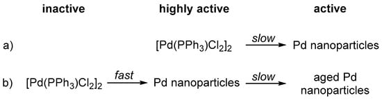 - [PdCl2(PPh3)]2 is an inactive precursor and degrades to highly-active Pd nanoparticles within the first seconds of irradiation. During the first hour of irradiation performance of these nanoparticles slightly decreases due to aggregation (Ostwald ripening) or blocking of active centres by a component present in solution (Scheme 1b).