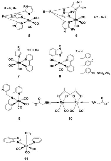 - Üstün, E.; Ayvaz, M.Ç.; Çelebi, M.S.; Aşcı, G.; Demir, S.; Özdemir, İ. Structure, CO-Releasing Property, Electrochemistry, DFT Calculation, and Antioxidant Activity of Benzimidazole Derivative Substituted [Mn(CO)3(bpy)L]PF6 Type Novel Manganese Complexes. Inorg. Chim. Acta 2016, 450, 182–189. [Google Scholar] [CrossRef]