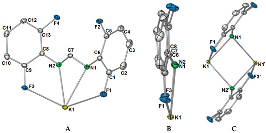 Complex 1 crystallised in the triclinic space group P-1, with only one potassium ion and one DFForm ligand in the ASU (Figure 1A). The DFForm ligand of the ASU is bound (F,N,N′,F′) to the ASU potassium ion. This tetradentate binding of the DFForm ligand contrasts that of the FForm ligand in [K(FForm)]∞ [19], where the ASU contains one FForm ligand bound η4(N,(Ar-C6,5),F) to potassium. As the K ion is bound by the DFForm NCHN bite in an almost symmetrical manner, and does not favour one nitrogen donor (as observed in [K(FForm)], the K···F–C bonding is weak, and thus the C–F bonds in 1 (of either C1/F1 or C9/F3, Figure 1) are almost unchanged from those of DFFormH (C–F: 1.3596(17)–1.3625(18)) [30]. By contrast, the asymmetrical NCHN binding of FForm to K in [K(FForm)]∞ (along with the coordination across the aromatic component), brings the fluorine atom into a closer proximity to the potassium atom (K–F: 3.029(4)), and weakens the C–F bond (C–F: 1.377(6) Å) [19]. Another example of such tetradentate (F,N,N′,F′) DFForm coordination was observed in the homoleptic cerium DFForm complex, [Ce(DFForm)3] [17], where one of three DFForm ligands is tetradentate, with the other two being tri-dentate (F,N,N′). In this example, all Ce···F–C interactions were identical at 2.92 Å (range: 2.9187(13)–2.9213(13)), and consequentially each C–F bond was also strained to a similar degree (range: 1.374(1)–1.376(1) Å). However, considering that a ten-coordinate cerium(III) is smaller than a nine-coordinate potassium (difference in ionic radii: −0.3 Å) [29], the tetradentate DFForm ligand for the cerium complex had to bend the aryl-rings towards the cerium ion to bring the fluorine atoms into proximity, causing a strain on the Cipso–N–CH angle (range: 126.4(2)°–128.3(2)°). However, due to the larger ionic radii of potassium, this phenomenon is not observed in 1 (range: 120.39(9)°–120.75(9)°).