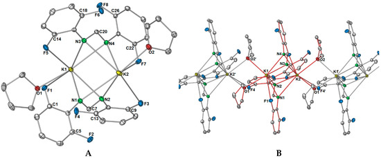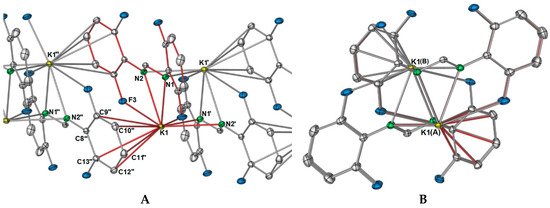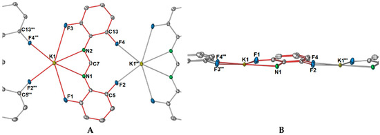 As shown in Figure 2A, there is an apparent coordination gap in axial positions of the potassium ions, and it is in this position that the other two fluorine atoms (namely, F2 and F4) of the DFForm ligand become relevant, and expand the one-dimensional polymeric network into a two-dimensional polymer. The further fluorine atoms (F2 and F4) coordinate to an adjacent potassium ion in a μ-(F″,F′′′) manner, generating a ten-membered ring (Figure 3A). Because of this additional coordination, the DFForm ligand is nearly planar across the K and K′′′ atoms, with the bond angle of K–N1/N2cent–K′′′ being 175.66(1)°. Although the auxiliary fluorine atoms are coordinated at a considerably shorter distance than the K–F1 and K–F3 analogues, there is still only a minor shortening of the C–F bonds from those of DFFormH (C–F: 1.3596(17)–1.3625(18)) [30]).