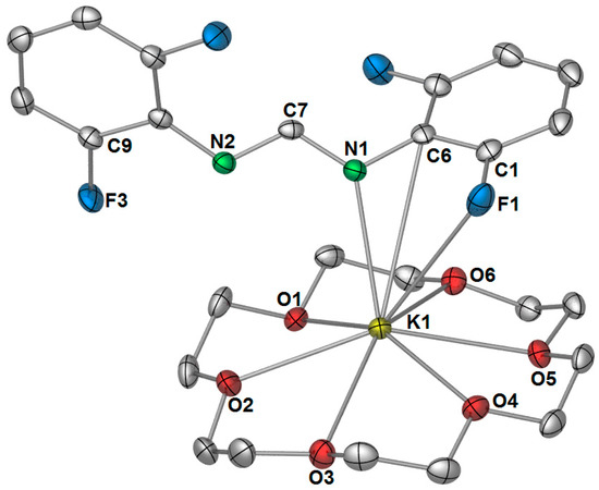 Although no monomeric [K(DFForm)(thf)x] species could be obtained from thf, we exploited the well-known affinity of 18-crown-6 for the potassium ion. Treatment of 1 with 18-crown-6 and crystallisation from a n-hexane/toluene solution, gave monomeric [K(DFForm)(18-crown-6)] (3). The structure was determined by X-ray crystallography, where the data were solved and refined in the monoclinic space group P21/n, with two molecules occupying the asymmetric unit (only one is depicted in Figure 6). The most surprising feature of this structure is the κ(N,C,F) coordination of the DFForm ligand to the potassium centre, as opposed to the expected κ(N,N′) coordination that is observed in [K(p-TolForm)(18-crown-6)] [32], and in several other C{NCXN}−C based ligand systems [18], such as [K(pyr)(18-crown-6)] (pyr = 1,3,4,6,7,8-hexahydro-2H-pyrimido[1,2-a]pyrimidide) [37]. The ipso carbon–potassium bond length (Figure 6) lies in the expected range for such interactions. For example, the ipso-carbon potassium interactions observed in the bimetallic 2,6-diphenylphenolate complex [KCa(OArPh)3], has a K–Cipso bond lengths of 3.391(6) Å [38] and the K–Cipso bond length in the phenylthiolato complex [K2Fe(SPh)4] is 3.477 (5) Å [39]. Despite the non-binding of N2, there is still charge delocalisation across the NCN bite, as there is only a slight shortening of the free C7–N2 bond, making it far too long for a formal double bond (e.g., DFForm(CPh3): C=N: 1.2762(12) Å) [17].