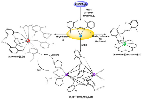 - Cole, M.L.; Junk, P.C. Potassium complexes of the ‘super’ formamidine (2,6-pr2iC6H3)NC(H)NH(2,6-pr2iC6H3), Hdippform.: Synthesis and molecular structure of [{K(DippForm)2K(thf)2}n]·nthf and [K(DippForm)(thf)3]·HDippForm. J. Organomet. Chem. 2003, 666, 55–62. [Google Scholar] [CrossRef]