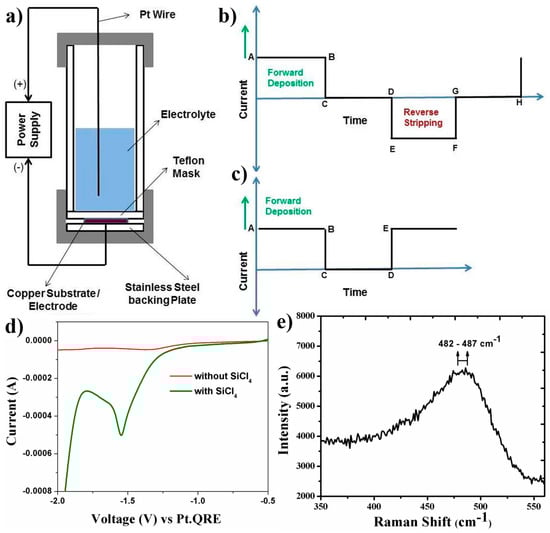 A solution of 0.5 M SiCl4 and 0.1 M TBACL prepared by dissolving 1.12 g TBACL and 2.3 mL SiCl4 in 37.7 mL PC under regulated atmosphere (O2 < 0.1 ppm and H2O < 0.1 ppm) in a glove box was used as the electrolyte for the PED. EC epsilon (Bioanalytical system, West Lafayette, IN, USA) was used to conduct linear sweep voltammetry (LSV) of the electrolyte in a cylindrical three electrode cell made of glass and sealed with teflon gaskets at both the ends. For the pulsed electrodeposition study, bare Cu foil was used as the working electrode while platinum wire (diameter = 0.5 mm, 99.95%, Alfa Aesar, Tewksbury, MA, USA, 1 mm distance from working electrode) and platinum foil (0.5 cm L × 0.5 cm B × 0.1 mm thick, 99.9%, Aldrich, St. Louis, MO, USA) served as the reference and counter electrodes, respectively.