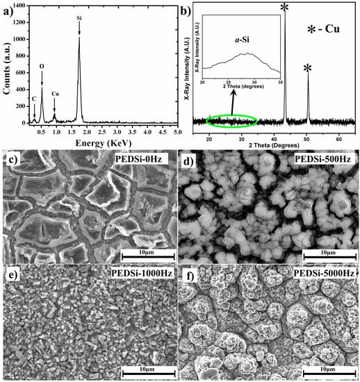 (a) Energy dispersive spectra (EDAX) and (b) XRD pattern of pulse current electrodeposited thin films. The inset in Figure 2b shows the smoothened XRD curve between 20° < 2θ < 35°. SEM images of (c) PEDSi-0; (d) PEDSi-500; (e) PEDSi-1000 and (f) PEDSi-5000 Hz.