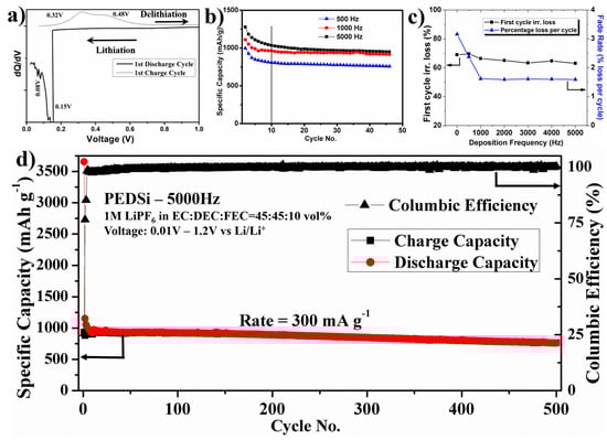 The pulse current deposited conditions showed very minor reduction in FIR with increase in frequency of deposition (Figure 3c) as compared to higher FIR loss exhibited by films deposited under direct current conditions. However, the fade rate in the first 10 cycles showed significant reduction from ~3.15% loss per cycle for films deposited under DC conditions to ~1.5% loss per cycle for PEDSi-5000 Hz. Upon long term cycling at a current rate of 0.3 A·g−1 (Figure 3d), the PEDSi-5000 Hz thin film showed a gravimetric specific discharge capacity of ~810 mAh·g−1 at the end of 500 cycles with a very low fade rate of ~0.056% capacity loss per cycle.