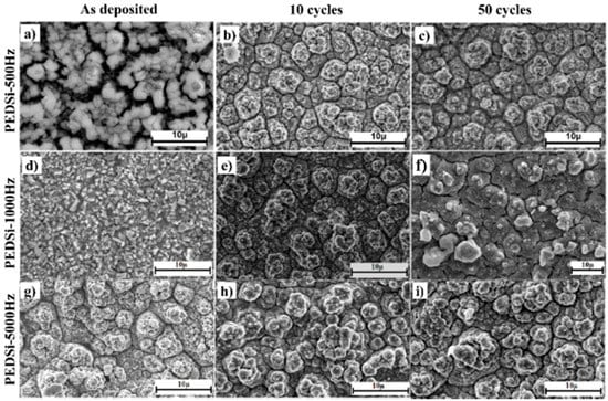 Post cycled SEM analysis of the films for DC conditions showed retention of the island morphology (or cracked film morphology) after 50 charge–discharge cycles which is consistent with the results reported in previous study [31]. PEDSi-500 Hz showed transformation of morphology to cracked thin film morphology during the initial 10 cycles and no further change in the morphology upon further testing till 50 cycles (Figure 4a–c). Continuous thin films deposited under PEDSi-1000 Hz (Figure 4d–f) and PEDSi-5000 Hz (Figure 4g–i), showed development of cracks during the initial 10 cycles of testing after which the films showed no major change in morphology upon further testing, thus indicating the stability of the films due to the improvement in mechanical properties. Electrodeposition being a controlled method involving atomistic adsorption, diffusion and reduction of ions followed by crystallization of atoms, improves the adhesion of thin film to the Cu substrate contributing to mechanical stability of the films. Hence, the electrodeposited films show better performance and stable cycling as compared to sputtered silicon films which fail due to delamination of the films at the substrate–silicon interface [7,55].